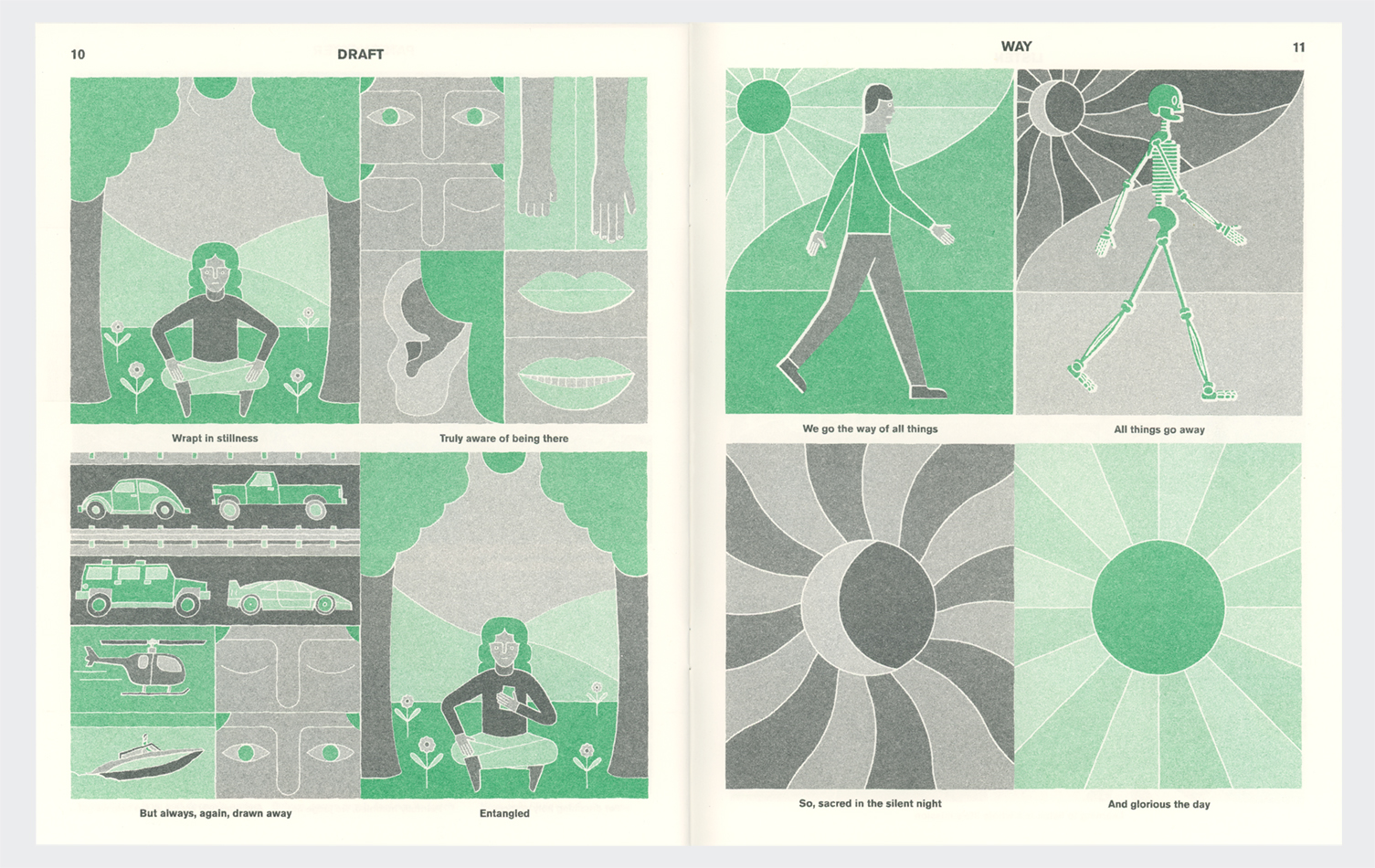 Not quite a comic, not quite a poem, Kairos deals with personal and civilizational crisis, anxiety, affirmation of Being and transformation. 8x10.5”, 20 pages, 1C Risograph, 2019. Edition of 50.