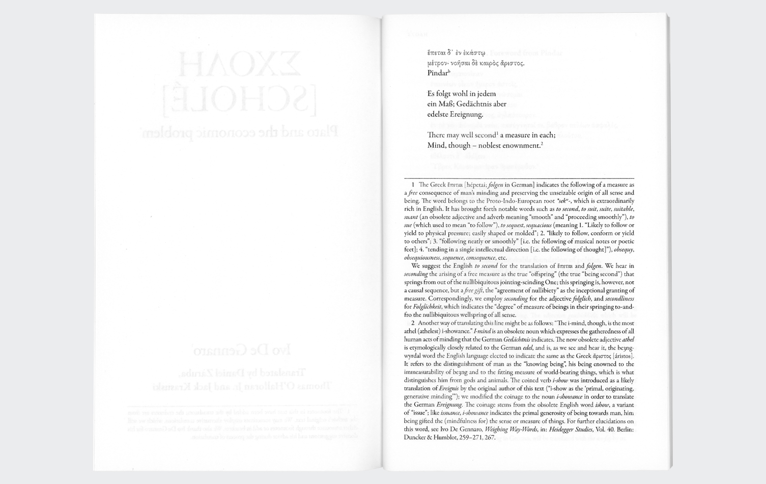 English-translation by Daniel Zaruba, Thomas O’Halloran Jr. and Jack Krasuski. Σχολή [Scholé] is typically translated as "leisure" and is the etymological root of "school". The essay explores the classically received relationship between σχολή and ἀναγκαῖα [anankaia] ("necessity") and attempts to think the relationship anew.